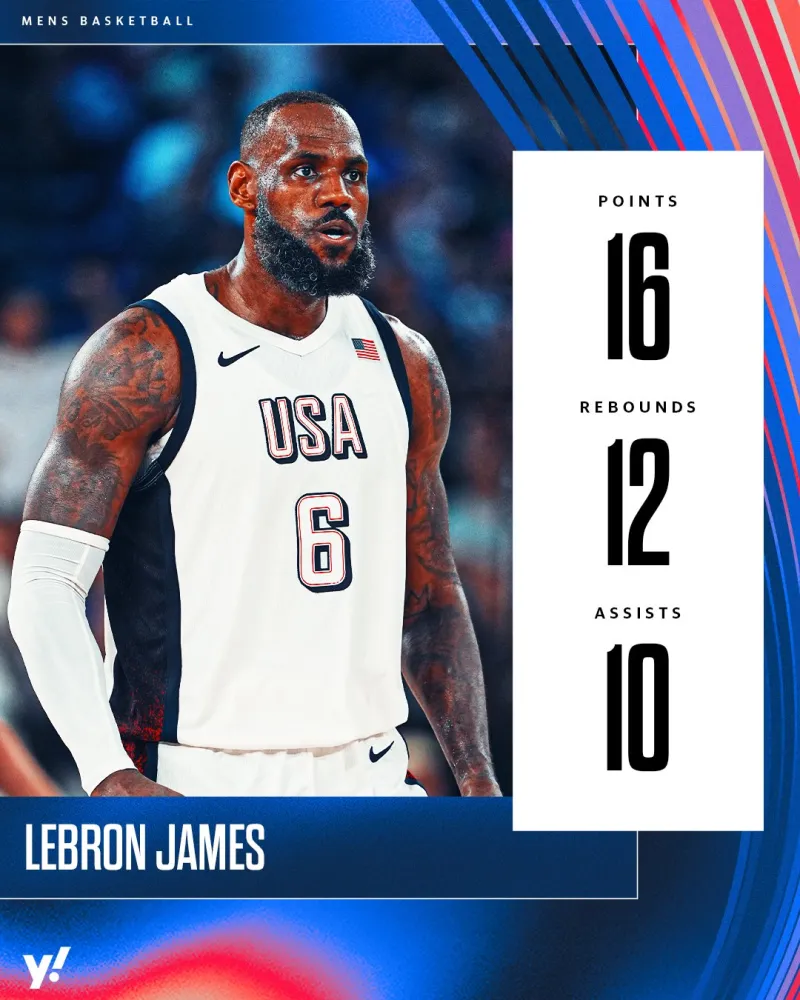 本场比赛,美国前锋勒布朗-詹姆斯上场32分钟,9投6中得到16分12篮板10助攻2抢断。詹姆斯本场取得奥运男篮史上第4次,个人奥运生涯第2次三双数据,历史唯一。