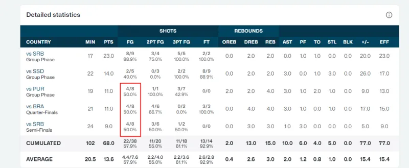根据FIBA官网的数据统计,杜兰特已经连续3场奥运比赛8投4中。