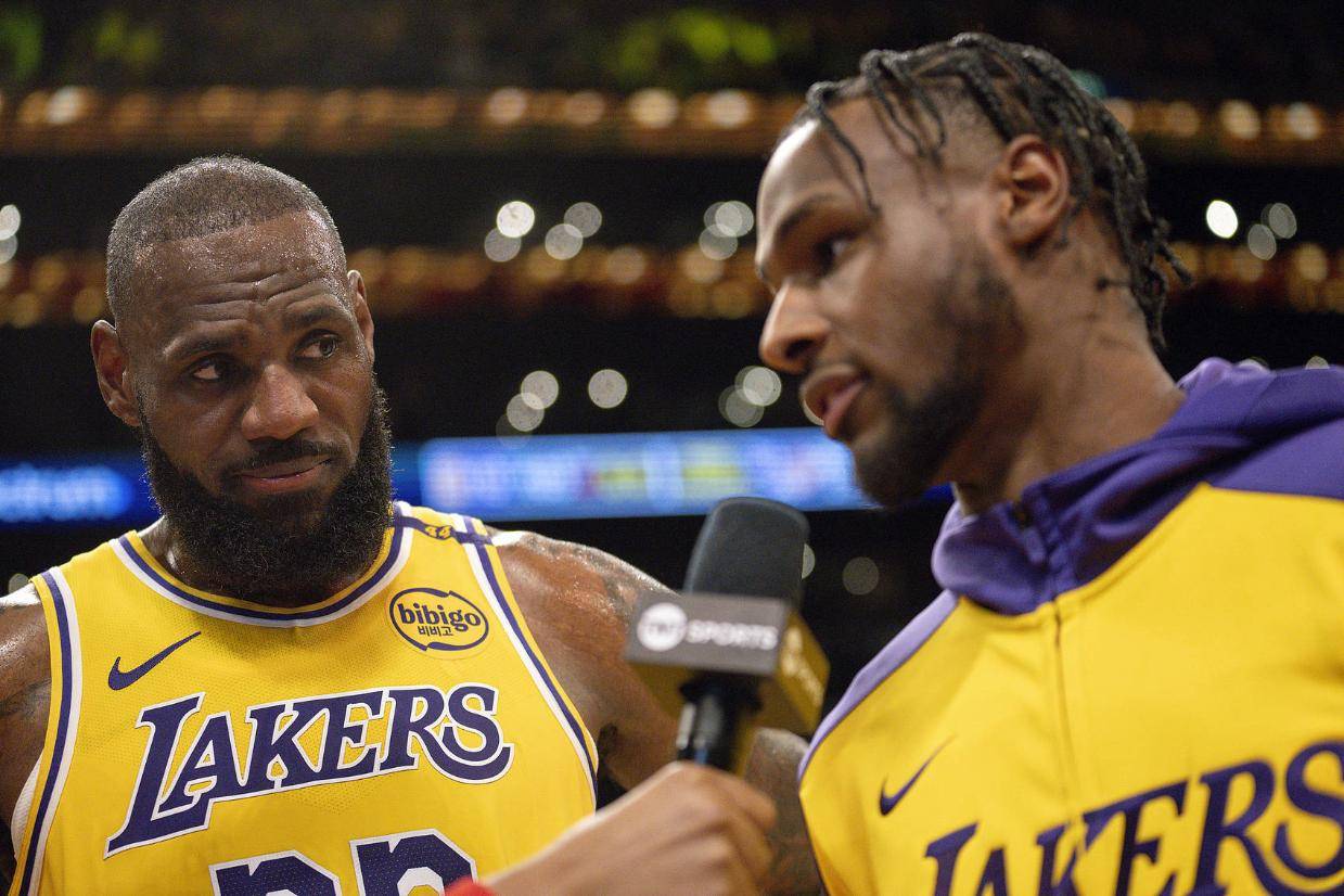 周三,詹姆斯和布朗尼上演NBA史上首次父子同台。但揭幕战,布朗尼只打了2分41秒,未得到1分,只抢下1个篮板。(搜狐体育原创:jim)